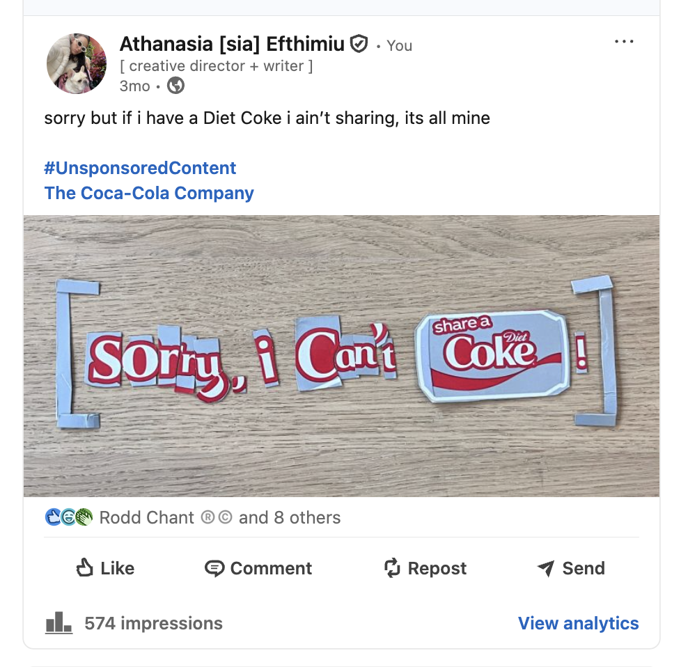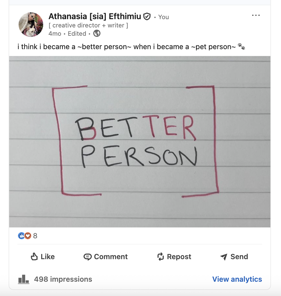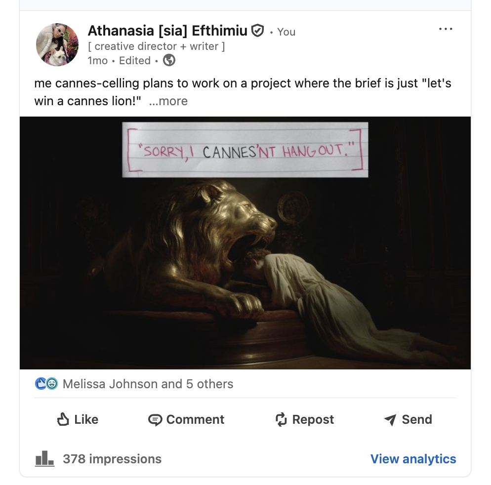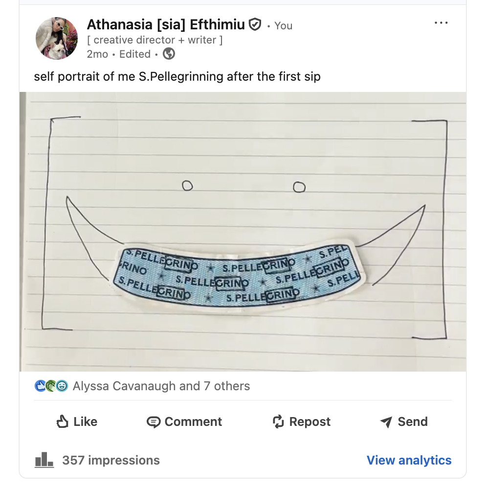 When I went freelance, I wanted to also get back to doing creative stuff for fun. So for 6 months I did a daily morning “creative exercise” and shared whatever came of it on LinkedIn. I really just wanted to make myself laugh and keep myself creatively stimulated. But some other people actually liked what I was sharing, and other people actively hated it, which made things even more interesting lol. Anyway, doing this helped me fall back in love with creatively exploring and experimenting. I’m still doing the daily exercises but now I’m experimenting with creating something different with them ;)